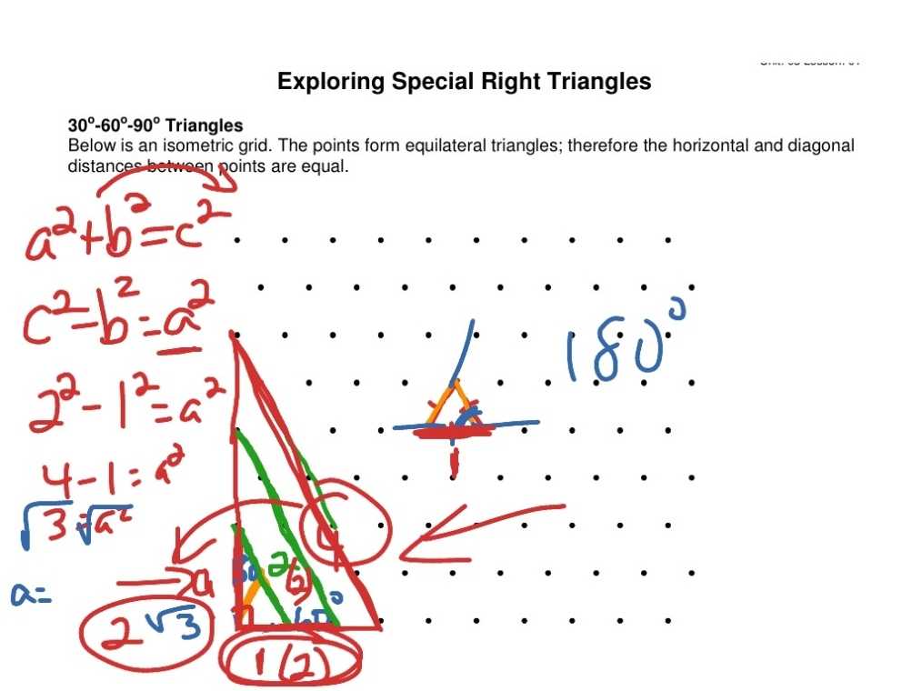 5. Give the students an opportunity to demonstrate their understanding by having them draw examples of special right triangles on the board. Have them explain their work, and point out the side lengths and angle measurements.