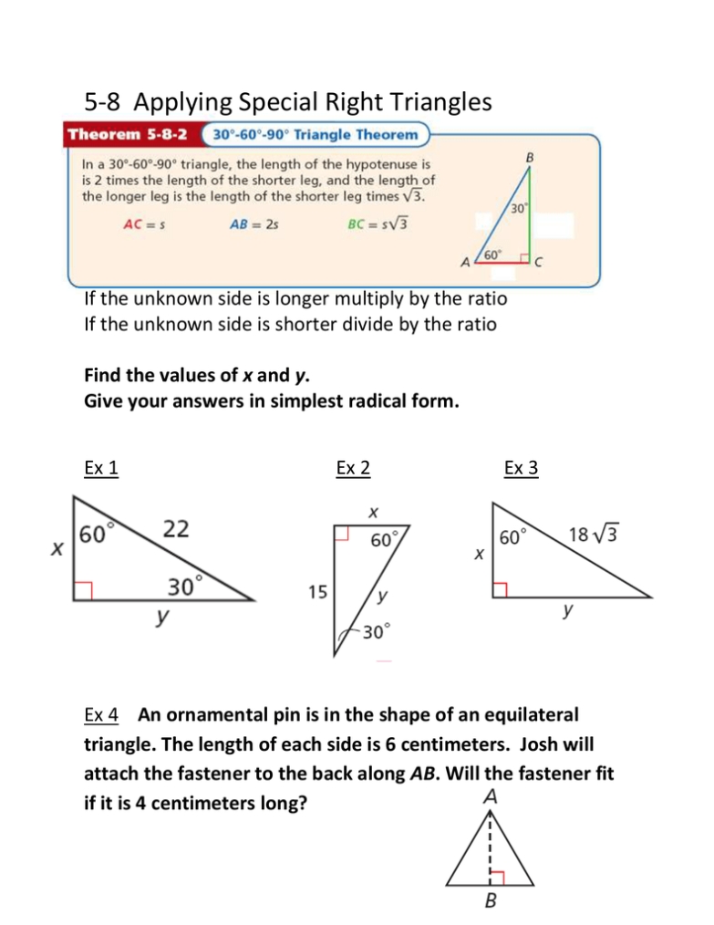 Special right triangles worksheets can be a valuable tool for teaching mathematics in the classroom. These worksheets can be used to help students learn and practice the concepts of special right triangles, which are triangles that have side lengths that are related in specific ways. By using these worksheets, students can gain a deeper understanding of the underlying mathematical principles and be better prepared to apply them in real-world contexts. Here are five ways to utilize special right triangles worksheets in the math classroom: