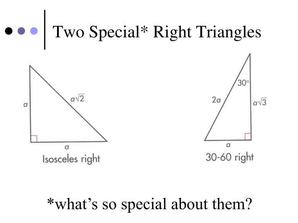 2. Demonstrate some examples of special right triangles on the board. Point out the side lengths and angle measurements, and explain how to calculate them. Provide some practice examples for the students to complete.