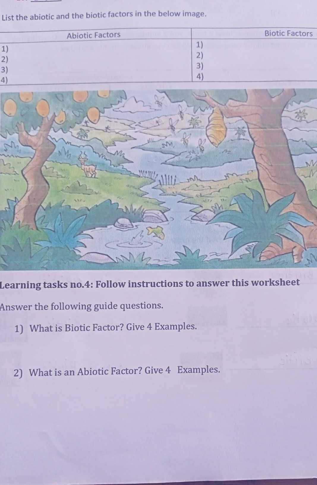 The worksheet begins by asking students to identify the abiotic factors of a particular environment. Examples of these would include temperature, sunlight, moisture, wind, soil, and water. For each abiotic factor, students should explain how it affects the environment and how it interacts with the biotic factors present.