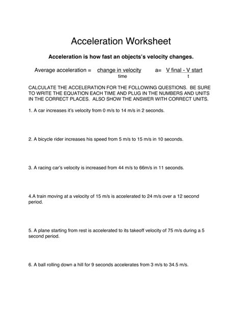 Finally, working through an acceleration practice problems worksheet can help to reinforce the principles of acceleration. This is especially important for students who may not have a strong understanding of acceleration or its applications. By working through the problems on the worksheet, students can become more familiar with the concepts and gain a better understanding of how they can be applied in the future.