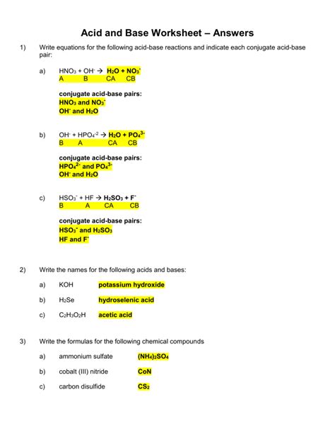 By completing the acid and base worksheet, students will gain a better understanding of the properties of acids and bases and how they interact with one another. This knowledge can then be applied to better understand and analyze chemical reactions in the laboratory.