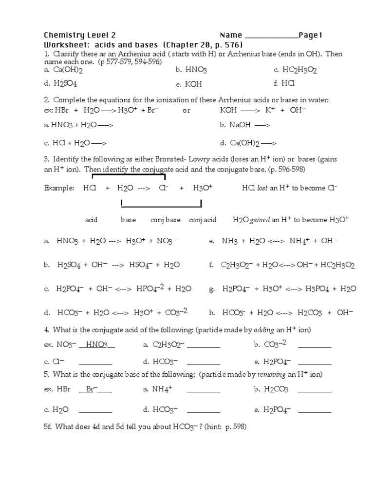 The worksheet should contain questions related to each of these topics. Questions should include definitions, examples, and calculations. For example, the worksheet could ask students to calculate the pH of a solution given the concentration of the acid and base.