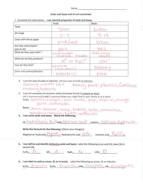 Acids and bases are important chemical compounds that can be found in everyday life. Acids have a sour taste and react with metals to produce hydrogen gas. Bases are usually slippery or soapy to the touch and react with acids to produce a neutral solution. In order to understand the properties of acids and bases, it is essential to use worksheet answers to help guide the learning process.