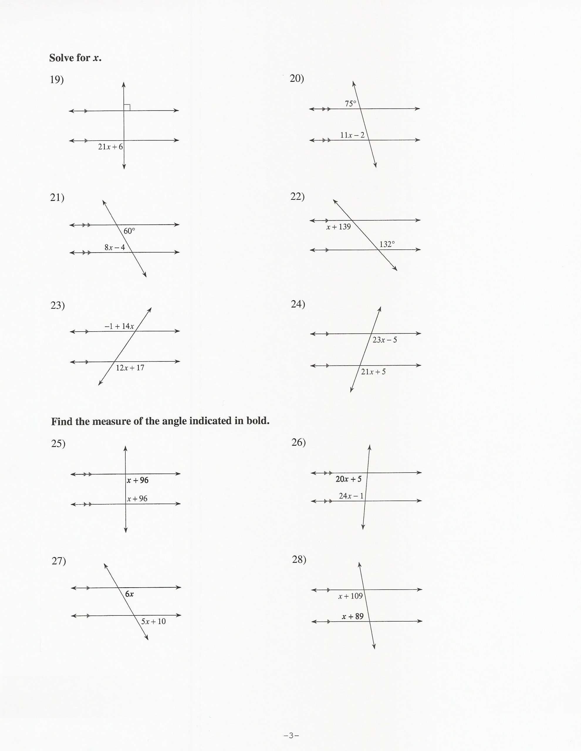The worksheets can be used to introduce a new concept, reinforce what has been learned in class, or as a review prior to a quiz or test. They can also be used to assess a student’s understanding of the concepts. Each worksheet contains a set of problems that require the student to identify and solve for angles and parallel lines in various contexts.