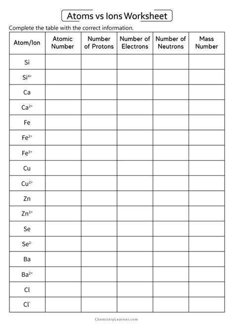 To create a comprehensive worksheet, begin by outlining the topics that need to be covered. The topics should include the structure of atoms, the different types of ions, the ionic charge, and the properties of ions. Once the topics have been identified, create questions that test the student’s knowledge of each topic. The questions should be based on facts, not opinion.