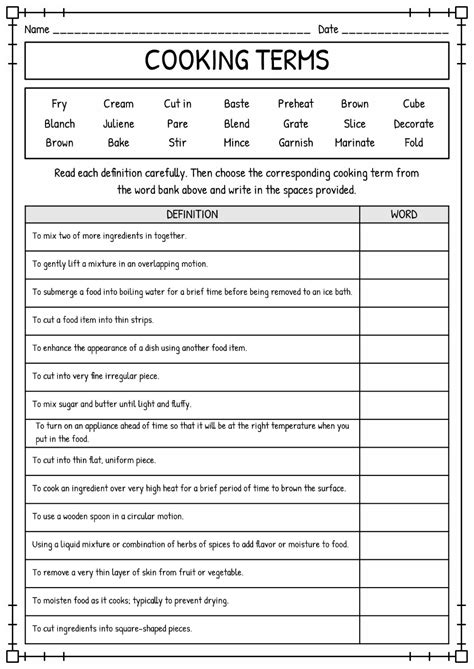 Another benefit of using a basic cooking terms worksheet is that it can help to improve the user’s understanding of the various techniques and methods used in the kitchen. By providing a clear definition of each term, the user is able to gain a better understanding of the cooking process and become more familiar with the equipment and ingredients used in the kitchen. This can be especially beneficial for those who are looking to expand their culinary skills and develop more advanced techniques.