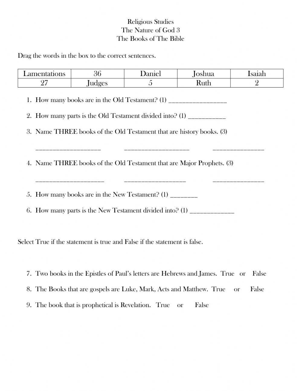 1. Introductory Activity: The purpose of a Books of the Bible worksheet is to help students familiarize themselves with the order of books in the Bible and to understand how the books are divided into different categories. As an introductory activity, have students complete the worksheet and then use it as a reference throughout the Sunday School class.