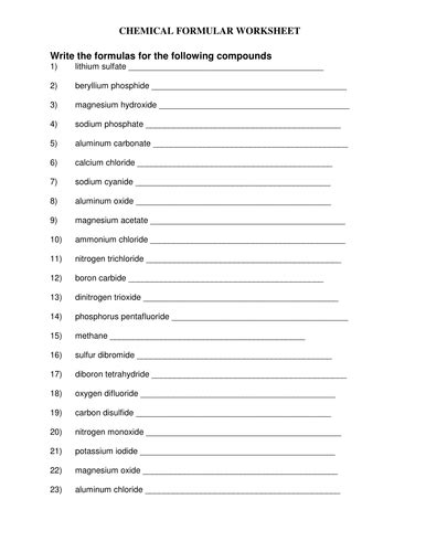 The primary benefit of using a chemical formula worksheet answer key is that it helps students to quickly identify the components of a chemical compound. By having an answer key, students can quickly identify the elements and compounds that make up the chemical equation, as well as their molecular weights and molecular formulas. This can help them to quickly identify the reactants and products of a reaction, as well as the direction and magnitude of the resulting reaction.