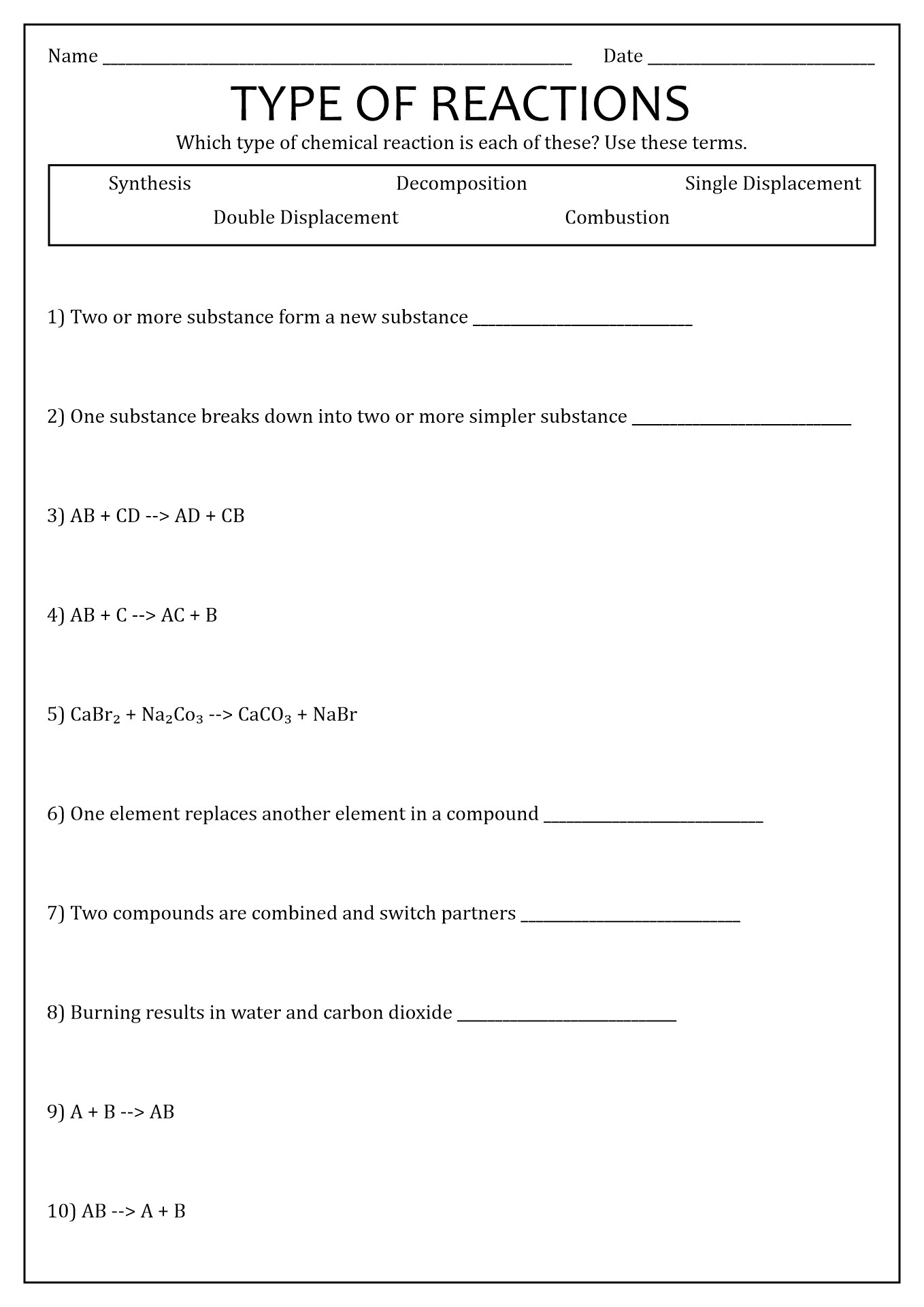 Chemical reaction type worksheets can be used as a means of introducing students to concepts such as oxidation and reduction, acids and bases, and the structure of atoms. By providing a step-by-step visual representation of these concepts, students can better comprehend the material and develop an understanding of the fundamentals of chemistry.