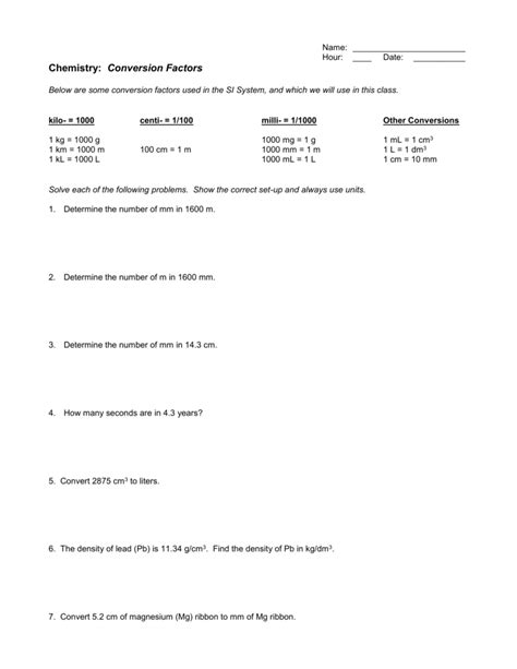 To conduct this analysis, a sample of chemistry conversion factors worksheets from various educational settings was collected. Each worksheet was then evaluated for accuracy by a team of experienced chemistry educators. The accuracy was determined based on the accuracy of the conversion factors and the associated mathematical calculations.