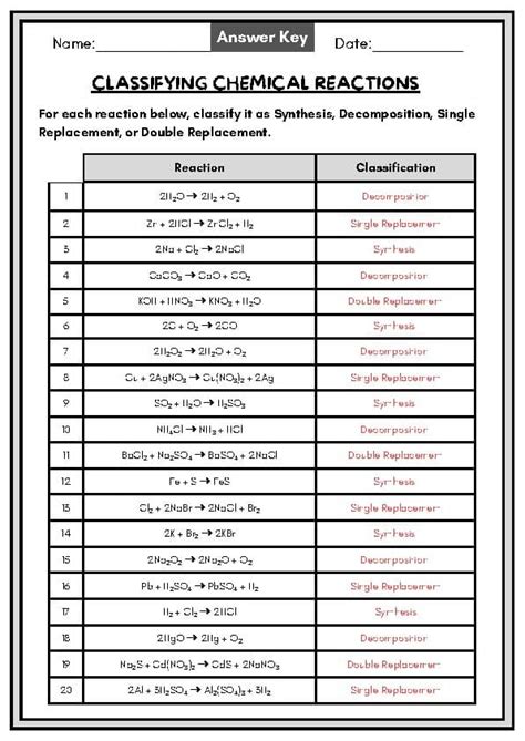 By utilizing classifying chemical reactions worksheets, students will gain a better understanding of the different types of reactions and the conditions under which they occur. This knowledge will enable them to better comprehend and apply their understanding of chemical reactions in real-world applications.