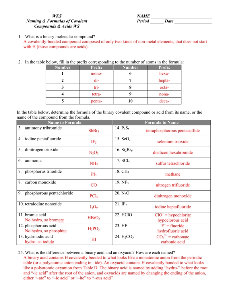 Naming Covalent Compounds & Acids Ws Key Within Compounds Names And Formulas Worksheet