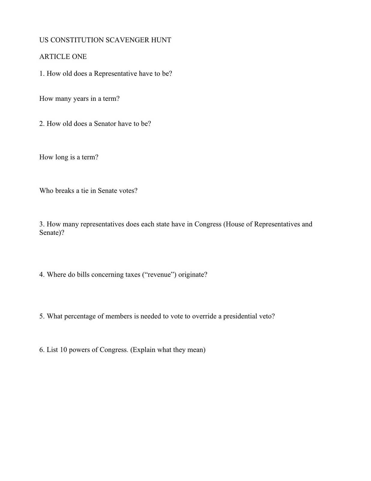 Overall, a Constitution Scavenger Hunt Worksheet can be a great way to engage students and help them learn about the US Constitution. By breaking the material down into manageable sections and providing interactive activities, the students are able to gain a comprehensive understanding of the document. This type of activity can also be used to supplement other activities in the classroom, such as debates and presentations, allowing for a more comprehensive learning experience.