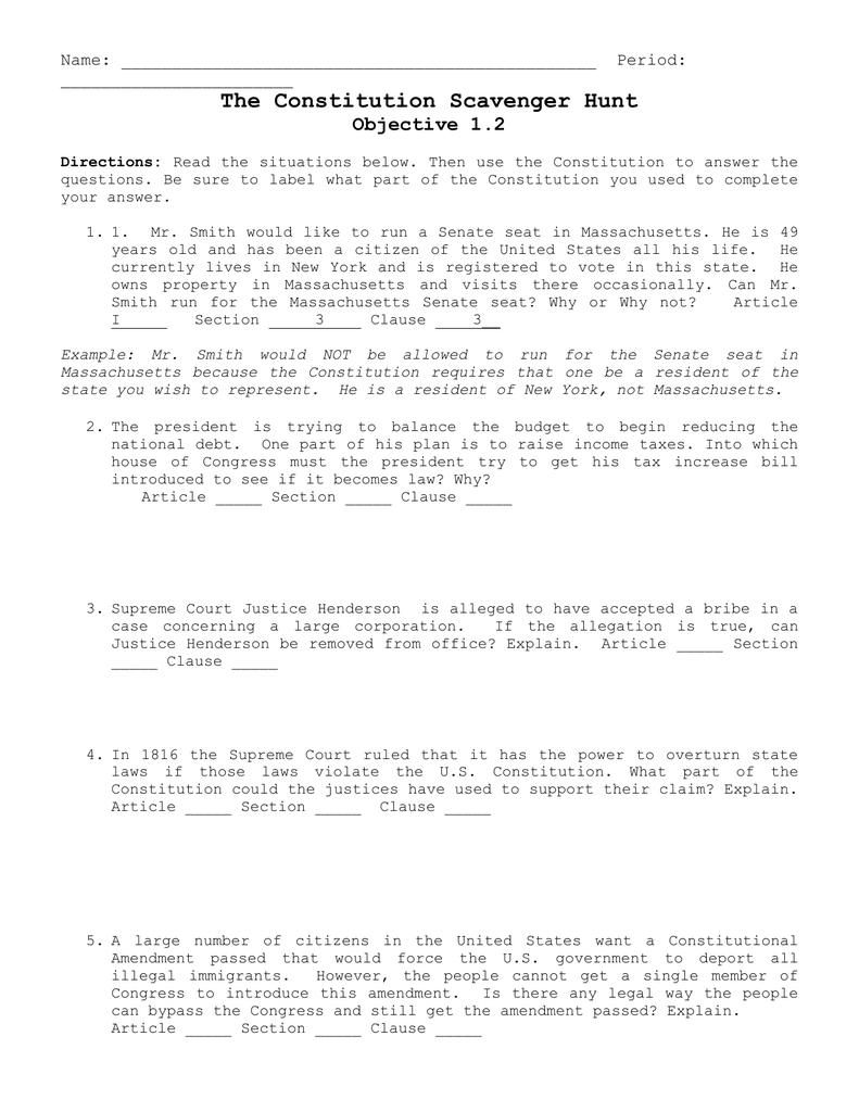 A Constitution Scavenger Hunt Worksheet is an excellent way to analyze the impact of the U.S. Constitution. This worksheet requires students to conduct research to answer questions about the Constitution and its amendments. By gathering information from the text of the Constitution and the Federalist Papers, students gain an understanding of the document’s contents and their implications.