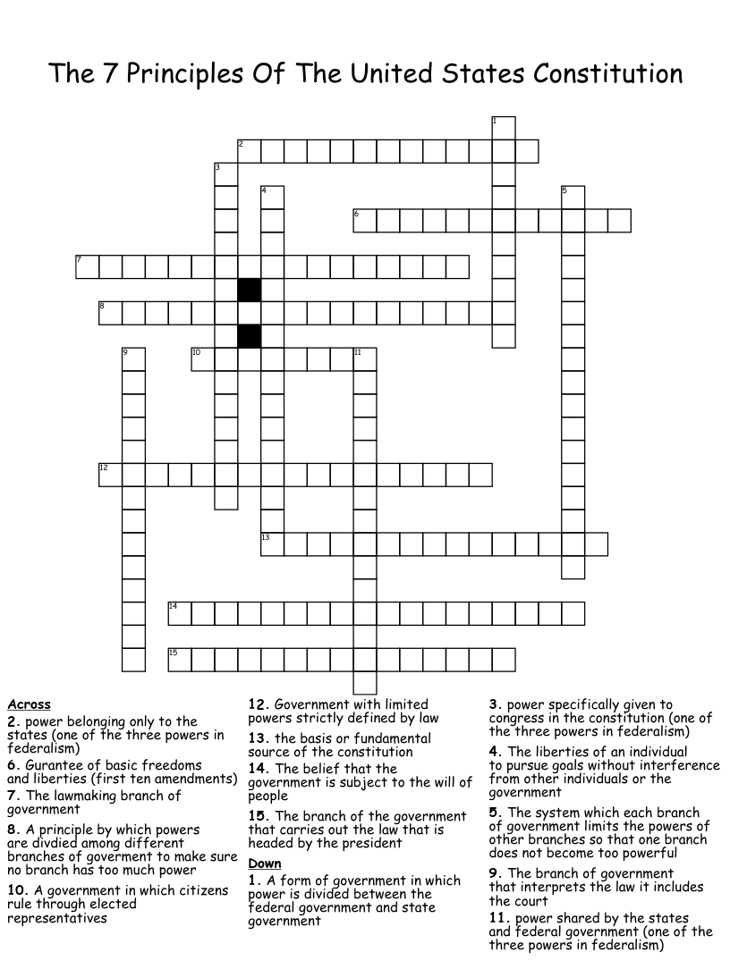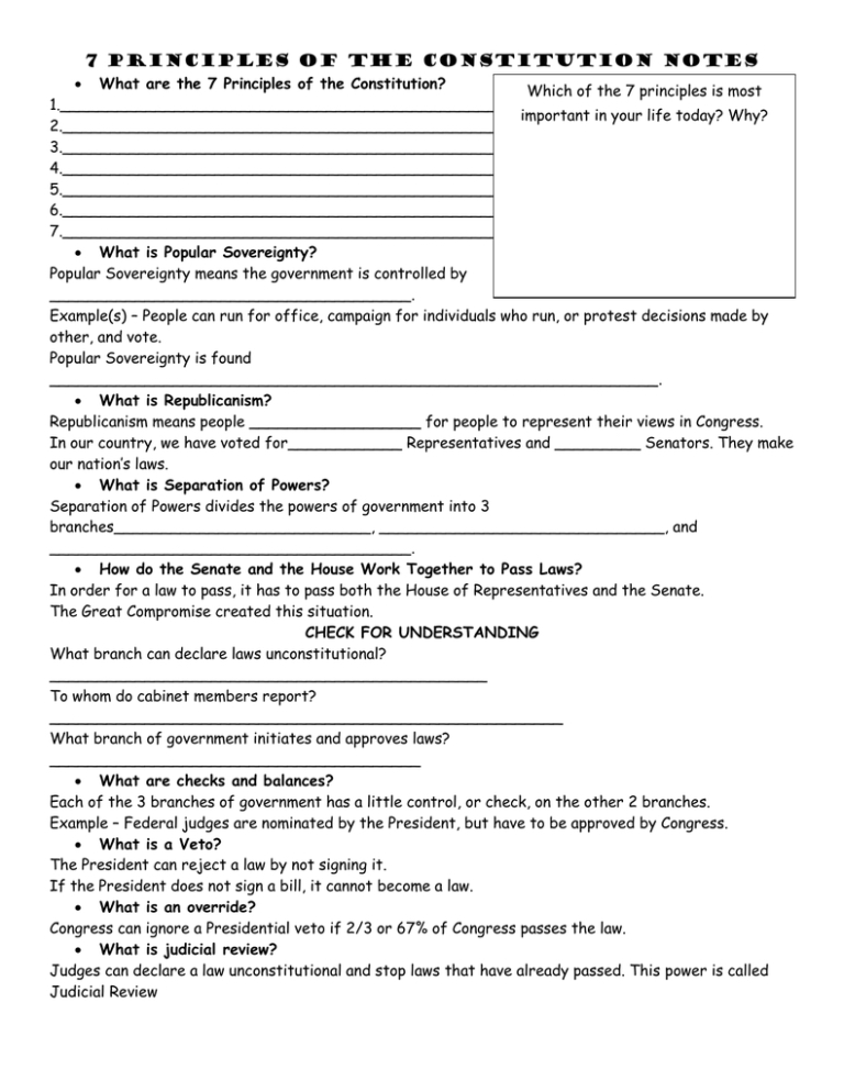A worksheet that focuses on constitutional principles can be a great tool to help students learn these principles and begin to think critically about them. This kind of worksheet can cover topics such as the separation of powers, checks and balances, and the role of the Supreme Court. Students can also be asked to consider how these principles apply to current events. Providing ample opportunity for reflection and discussion can help students to make more meaningful connections between constitutional principles and their own lives.