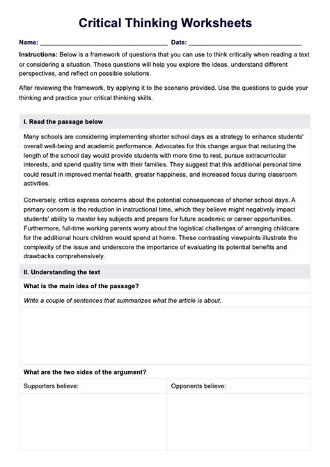 The process of critical thinking involves examining and analyzing information to draw sound conclusions. A critical thinking worksheet helps to structure this process by providing a set of questions and criteria used to assess the validity and usefulness of any given information.