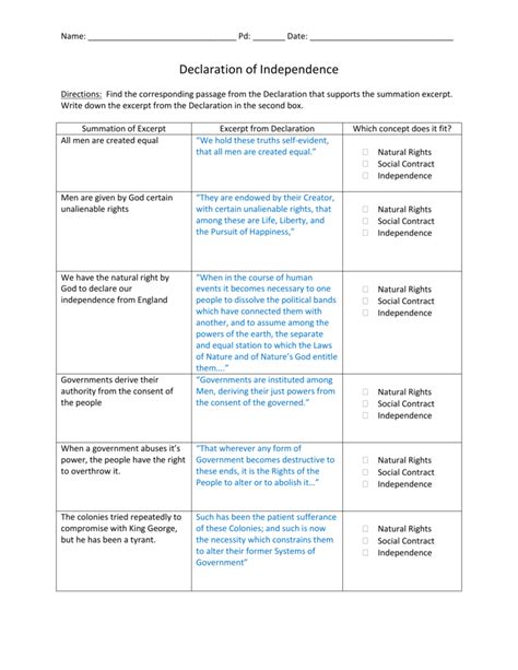 The Declaration of Independence worksheet answers provide us with an understanding of the core values of the Founding Fathers. It underscores their commitment to democracy, freedom, and self-determination. It explains the grievances the colonists had against the British government, which ultimately led to the break from the monarchy. The Declaration affirms the rights of the people to life, liberty, and the pursuit of happiness. It also outlines certain unalienable rights, such as freedom of speech and the right to bear arms.