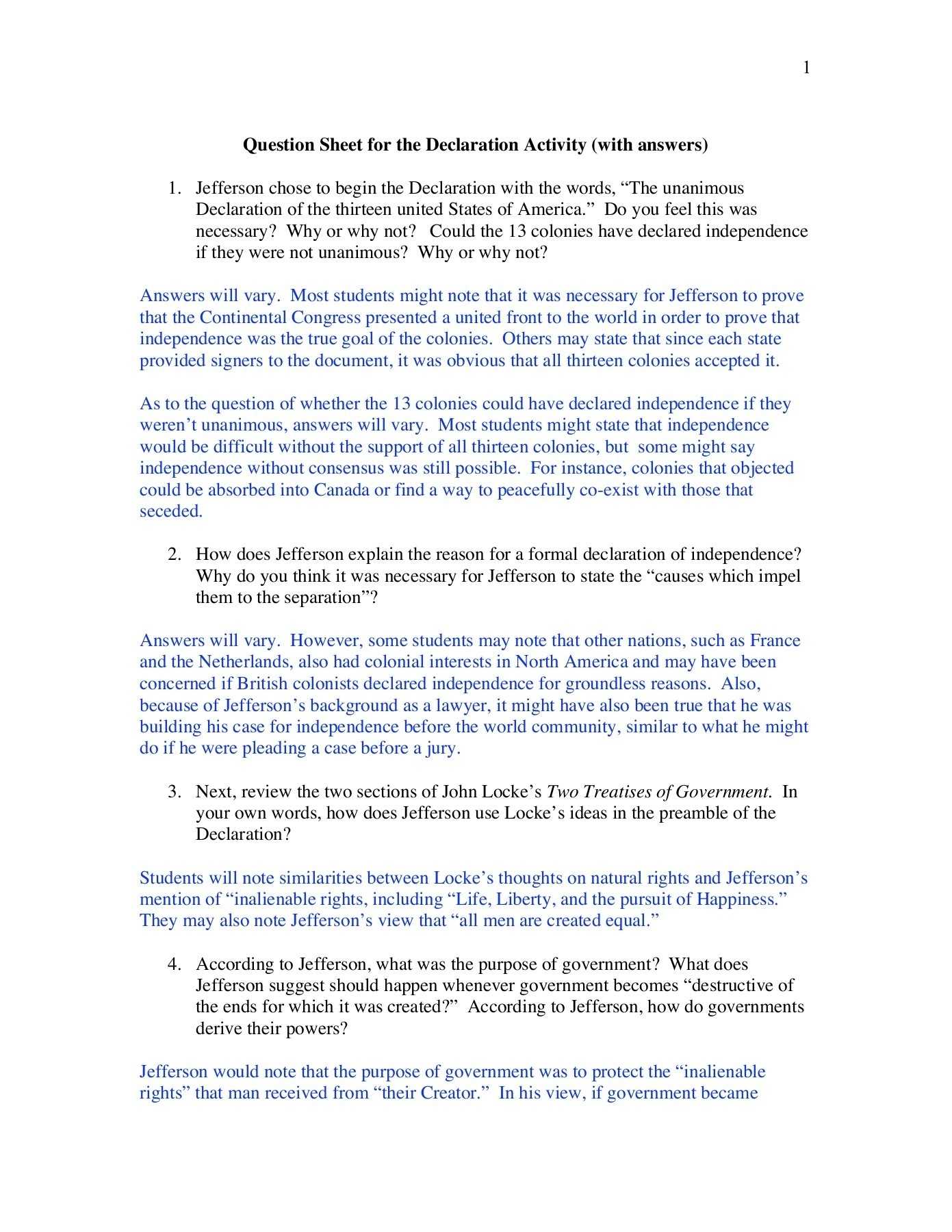 Exploring the Significance of the Declaration of Independence Worksheet Answers