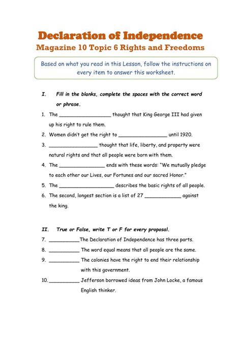 The worksheet begins by providing an overview of the Declaration of Independence. It explains the circumstances that led to its creation and the reasons for its drafting. The worksheet then discusses the central ideas of the Declaration and the grievances of the American people against the British government. It then examines the impact of the Declaration on the Revolutionary War, including how it inspired the colonies to unite against British rule and how it established the United States as an independent nation.