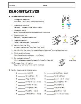 A continuación se presentan dos hojas de trabajo con ejercicios relacionados con los adjetivos demostrativos. Estas hojas de trabajo se pueden utilizar para ayudar a los estudiantes a desarrollar su vocabulario español con los adjetivos demostrativos. Los ejercicios en estas hojas de trabajo incluyen: