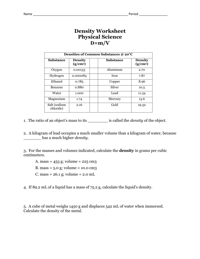 32 Density Calculations Worksheet 1 - Free Worksheet Spreadsheet In Density Calculations Worksheet 1