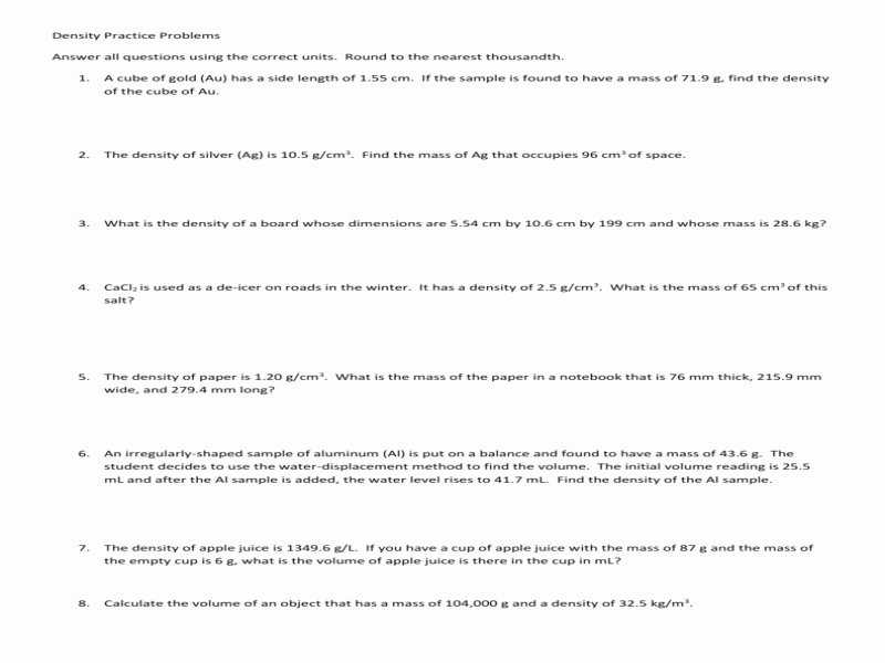 To use a density calculations worksheet, one should begin by recording the mass of the sample in grams. This can be done using a laboratory balance. Once the mass is recorded, the volume of the sample must be measured. This can be done by filling a container of known volume with the sample and measuring the amount of displacement that occurs.