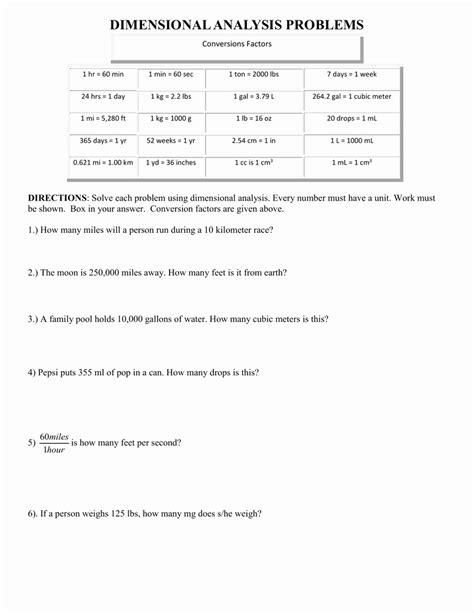 The use of a dimensional analysis worksheet also helps to simplify the process of solving problems. By breaking down the problem into smaller, more manageable parts, students can more easily identify the steps needed to achieve a successful outcome. This approach can also help to reduce the amount of time required to solve a problem.