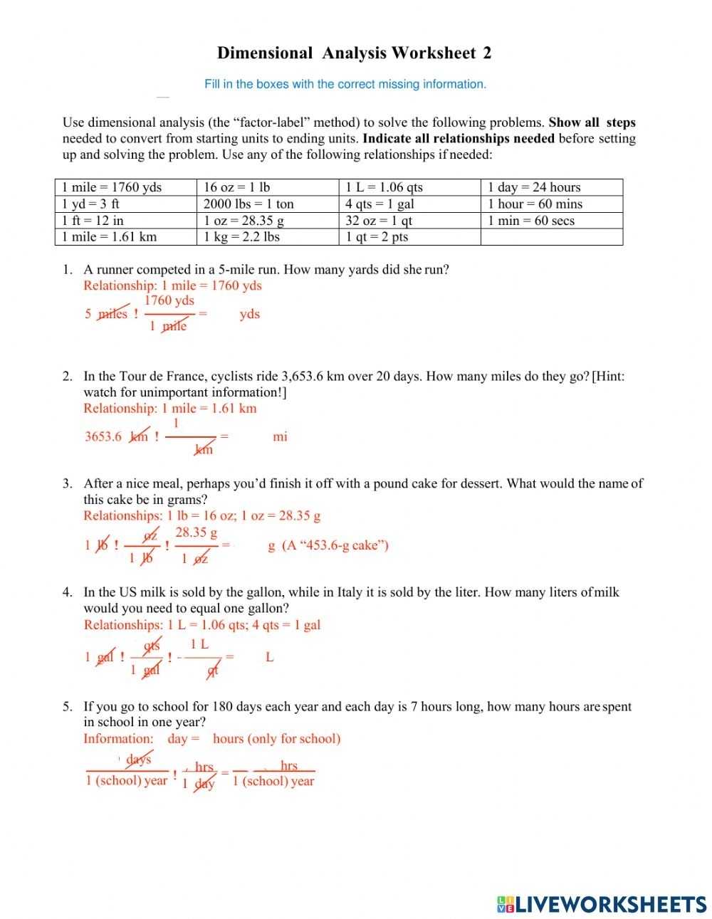 Next, the equation should be written on the worksheet. This equation will include the given quantity, the desired unit, and any necessary conversion factors. Once the equation is written, it can be solved using the dimensional analysis worksheet.
