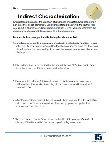 Indirect characterization worksheets provide a different approach to understanding characters. These worksheets often ask students to consider a character’s actions, dialogue, and appearance, as well as how other characters react to them, in order to draw conclusions about the character. This method of characterization allows students to think more critically about the characters and their motivations, as well as to recognize how other characters may be influenced by the character in question.