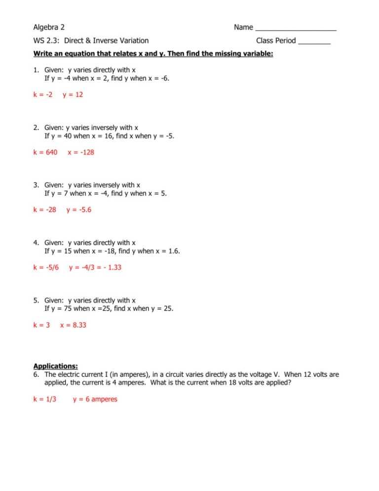 The worksheet can then be used to reinforce the concept of direct variation. Students can use the worksheet to practice solving direct variation equations. This can help them to understand the concept better, as well as to become more comfortable with solving the equations.