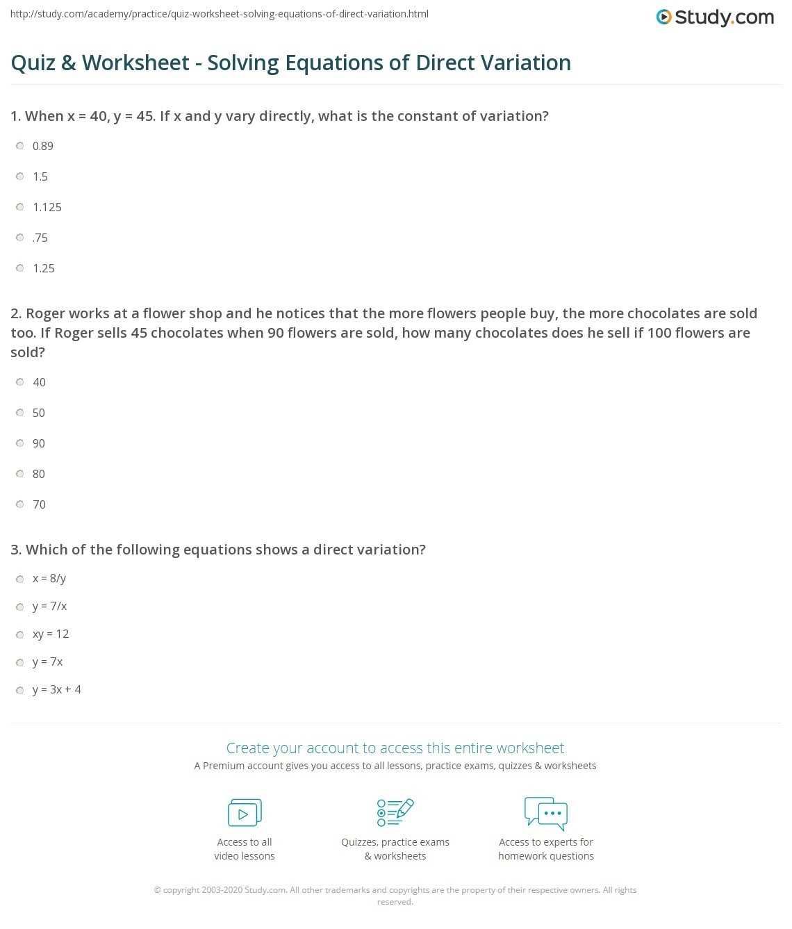 Direct variation worksheets offer numerous benefits in helping students understand and practice direct variation. First, worksheets provide students with an opportunity to practice solving direct variation equations. This practice helps students become familiar with the process of solving direct variation equations and builds their problem-solving skills.