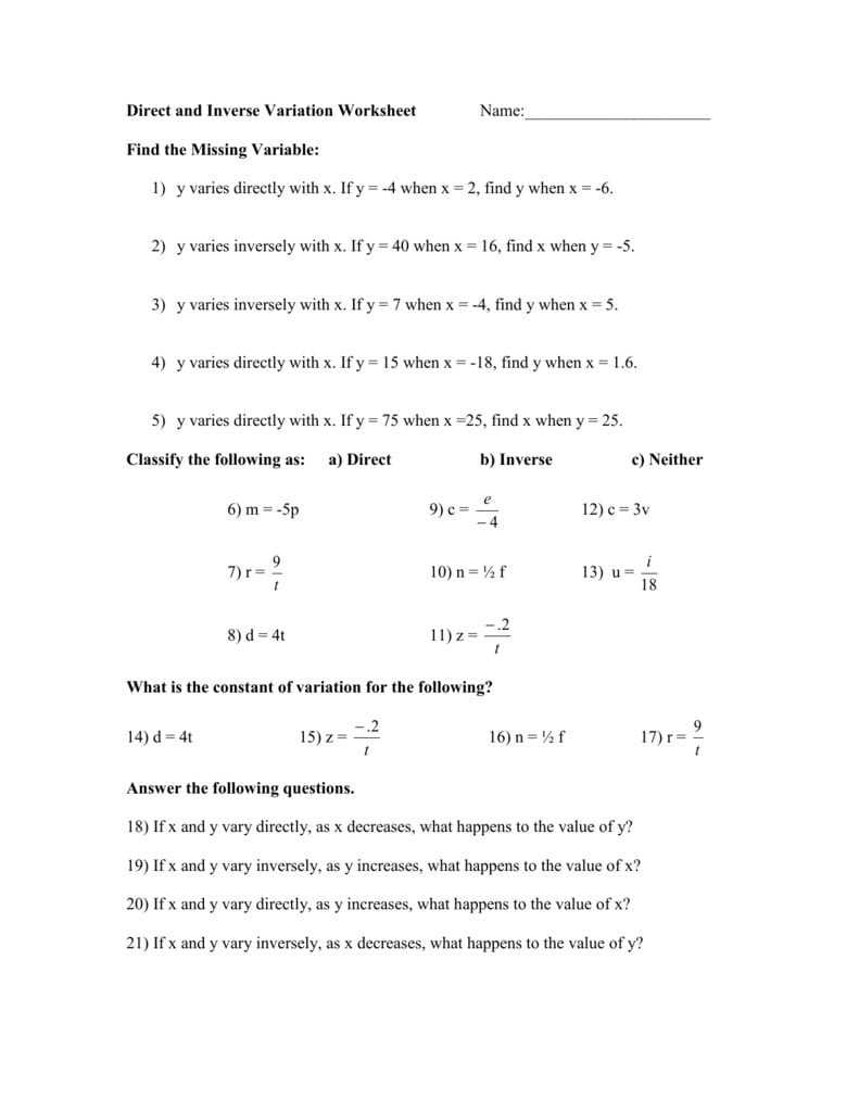 Direct variation worksheets can also be used to help students understand how to use direct variation to solve different types of problems. By solving equations that involve both linear and nonlinear relationships, students can gain a deeper understanding of direct variation and its applications.