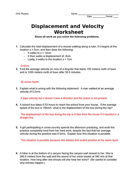 Finally, the worksheet should provide an explanation of how the relationship between displacement and velocity can be used to solve problems. For example, if an object is traveling at a velocity of 15 meters per second for a period of 10 seconds, the displacement can be determined by multiplying the velocity by the time period, resulting in a displacement of 150 meters.