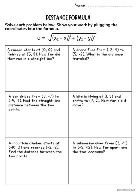 The Distance Formula Word Problems Worksheet is a great resource for helping students understand the concept of distance formula and how to apply it in real-world situations. By completing the worksheet, students gain a better understanding of how to calculate distances between two points and how to use it to solve a variety of problems. With practice and guidance, students can become proficient in using the distance formula and can use it to solve various types of problems.