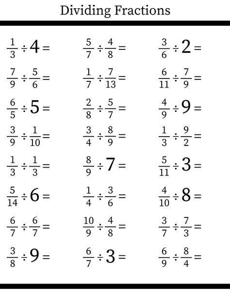 Creating an engaging dividing fractions worksheet PDF requires careful consideration of the content and design of the worksheet. The content should be clear and concise, providing students with a step-by-step guide on how to divide fractions. The design should be visually appealing, providing students with a positive and engaging experience.
