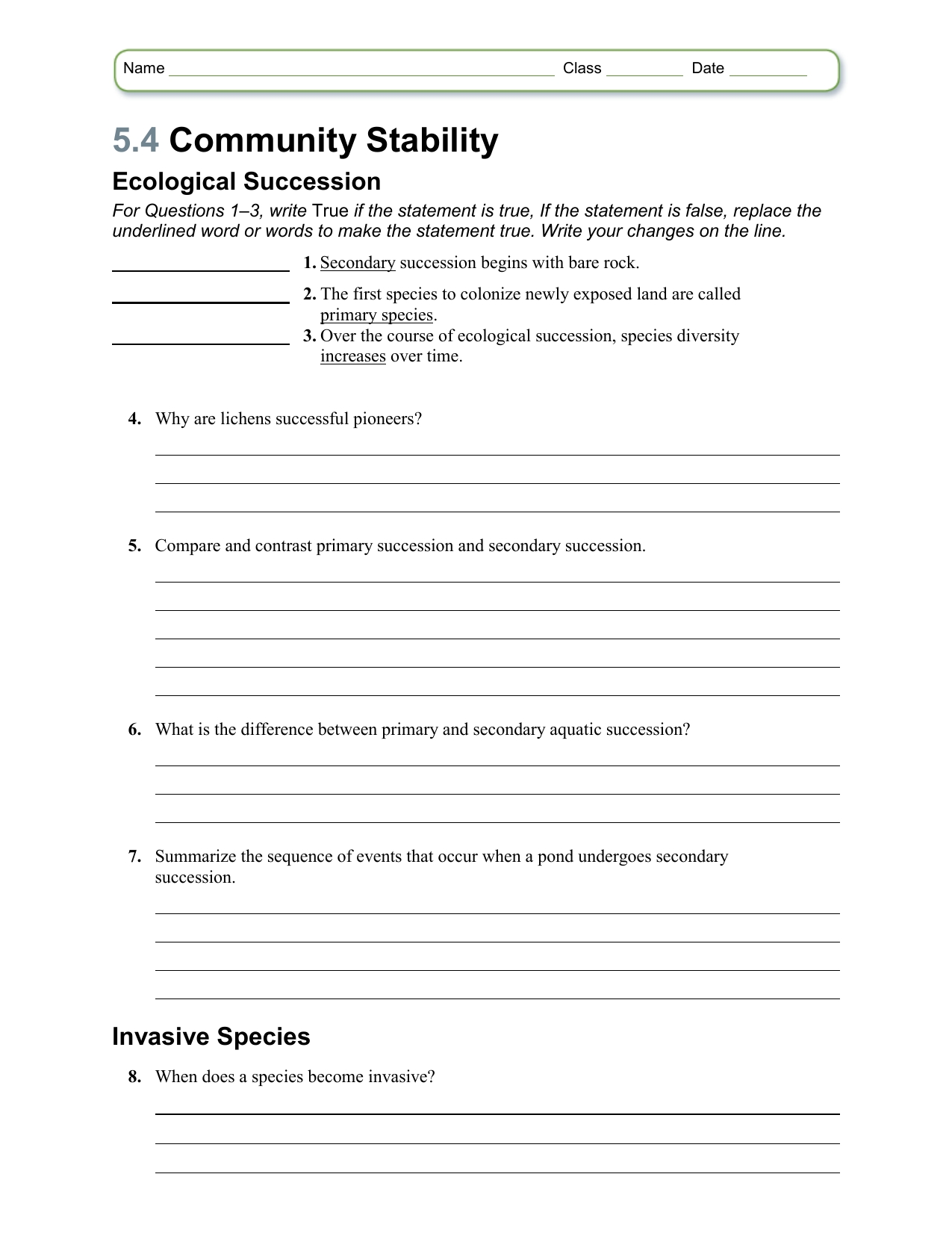 An ecological succession worksheet answer key is a valuable tool for understanding the dynamics of ecological succession. Ecological succession is the process by which a community of organisms develops within an environment over time. This process can be divided into stages, each of which is characterized by a distinct group of organisms. By studying the answer key to a worksheet on ecological succession, one can gain a better understanding of the sequence of events that occur during the process.