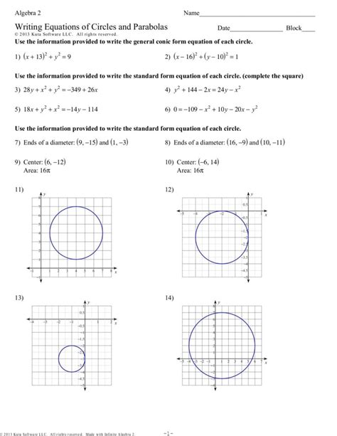 The equations of circles worksheet is an excellent tool for teaching students the principles of circular motion and the properties of circles. The worksheet contains several equations related to circles, such as the equation of a circle, the radius of a circle, and the circumference of a circle. It also includes exercises in which students must solve for the area of a circle, the circumference of a circle, and the arc length of a circle.