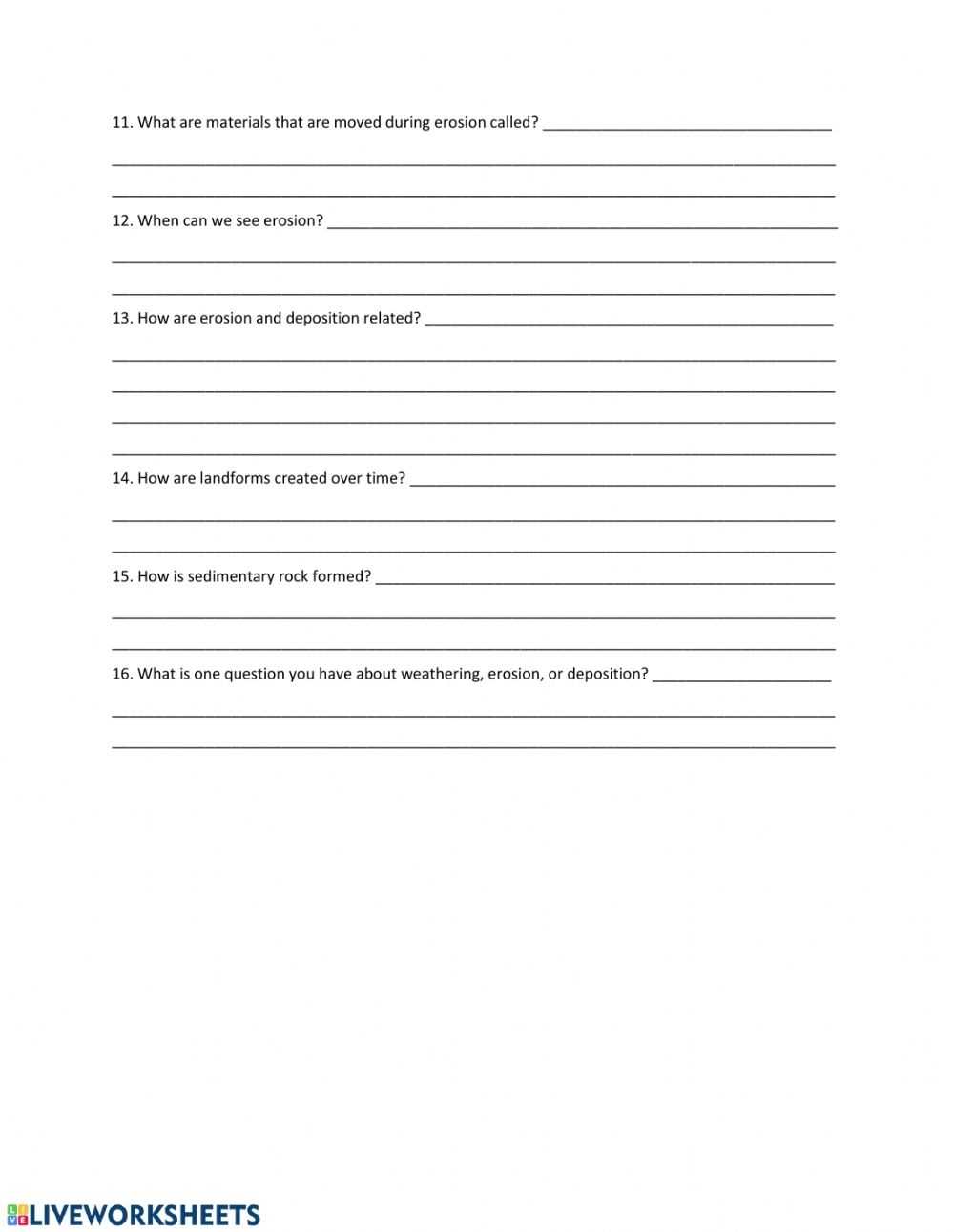 The worksheet should also ask students to explain the effects of erosion and deposition. For example, students can be asked to explain how erosion can lead to the formation of new landforms, such as gorges, canyons, and valleys. They should also be asked to explain how deposition can lead to the formation of new landforms, such as deltas, floodplains, and meanders. In addition to these questions, students can also be asked to identify the positive and negative impacts of erosion and deposition on the environment.