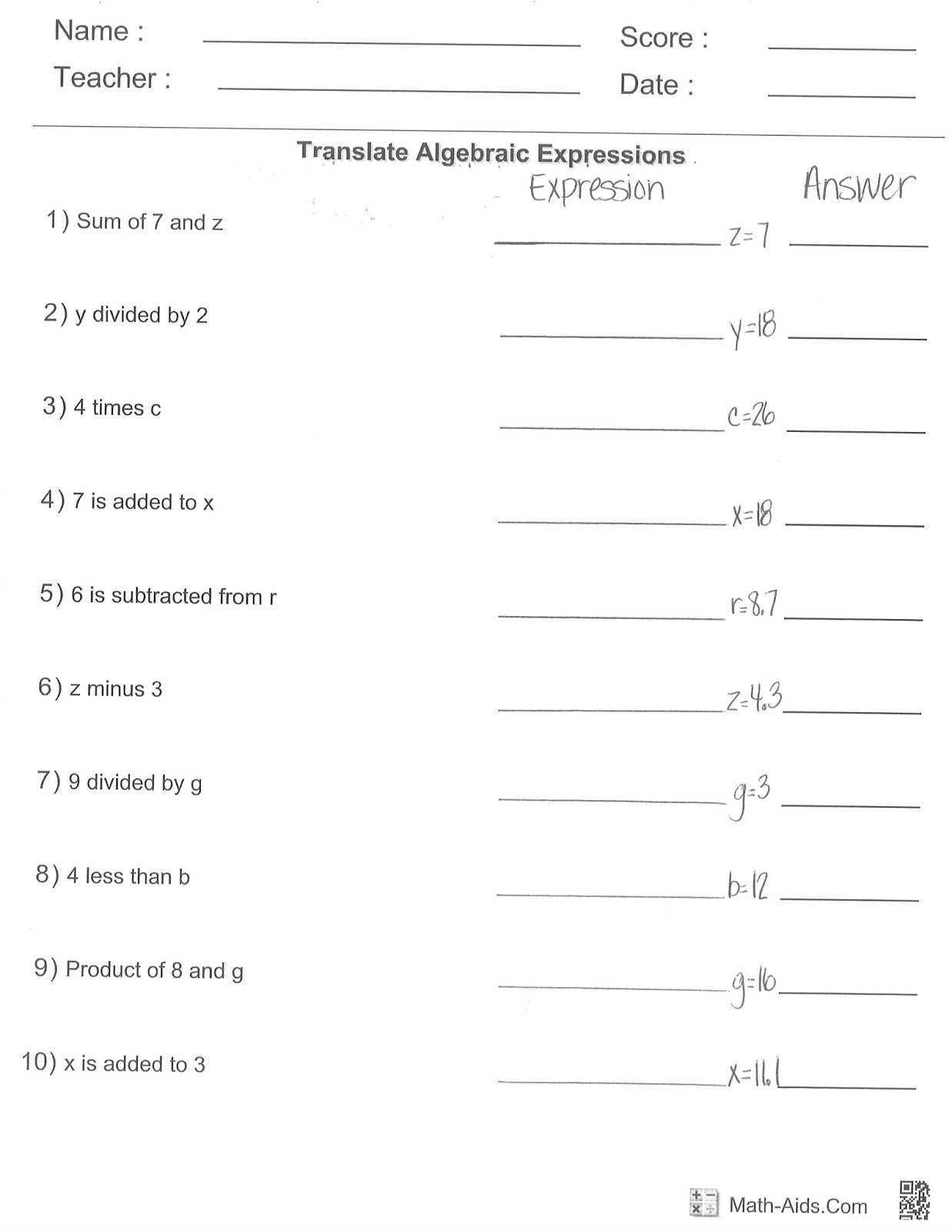 3. Offer worksheets with a combination of visual and written problems. Use diagrams and charts to help students visualize the expressions and equations.