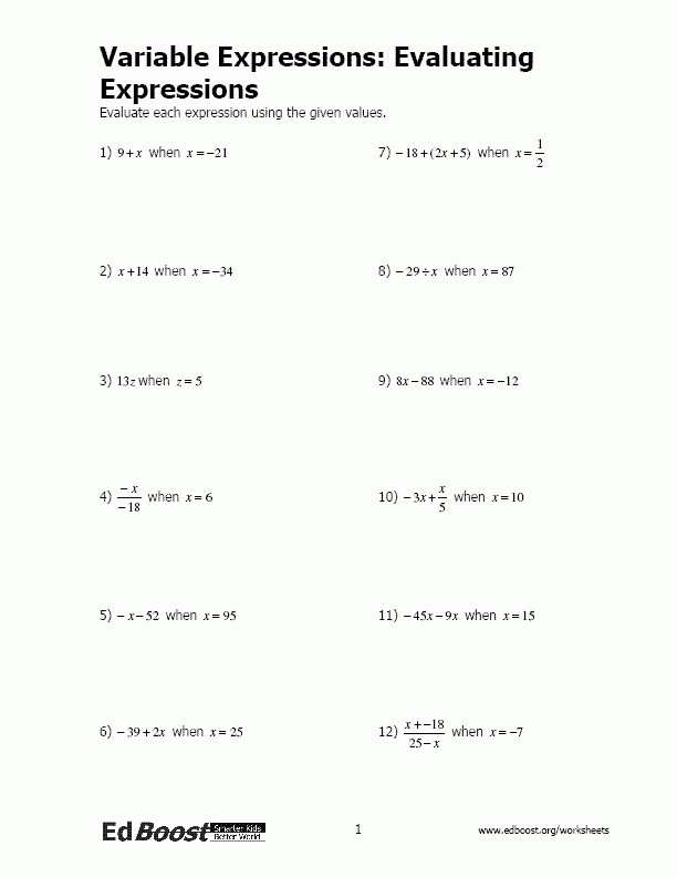 An evaluating variable expressions worksheet can also help to reinforce the concepts that students have already learned. By going over and reviewing the material, students can gain a better understanding of the concepts and can become more comfortable tackling difficult problems. This type of worksheet can also be used to introduce new concepts to students and help them to become more familiar with them.