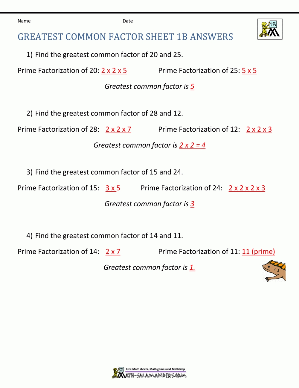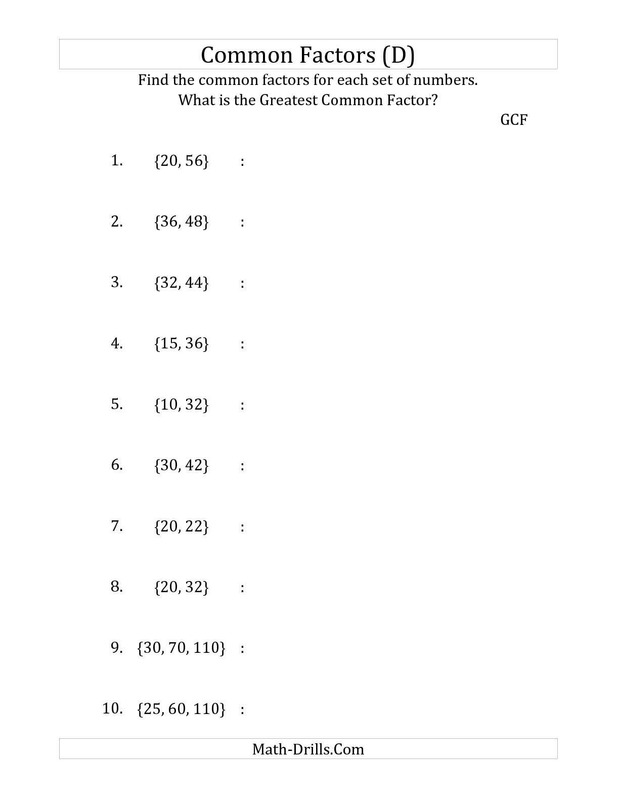 For example, if a worksheet asks a student to find the GCF of 12 and 20, the student would need to list the factors of 12 (1, 2, 3, 4, 6, 12) and the factors of 20 (1, 2, 4, 5, 10, 20). The greatest common factor of 12 and 20 would be 4.