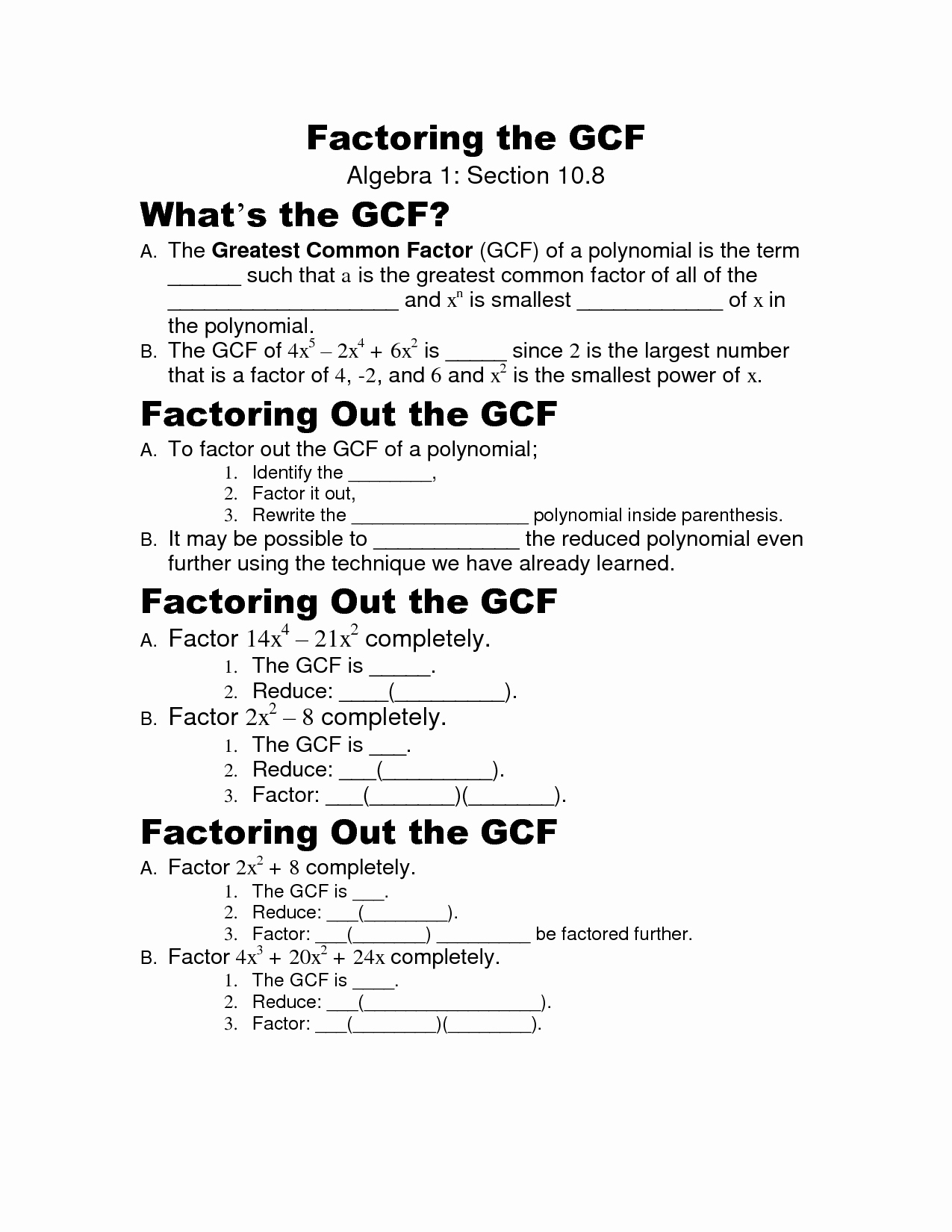 Greatest Common Factor (GCF) worksheets are a valuable resource for students learning the basics of factoring. GCF worksheets provide students with the essential skills they need to factor polynomials. Through working with these worksheets, students are able to gain an understanding of how to factor polynomials, as well as practice the skill of factoring.