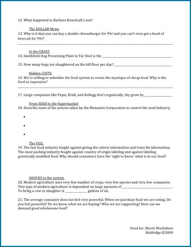 For example, a food inc worksheet may reveal that a particular supplier is producing more food than it can sell, leading to food waste. By identifying this problem, the company can take steps to reduce the amount of food produced or find another supplier that can better meet their needs. Additionally, food inc worksheets can help companies identify where food waste is occurring in the supply chain and take steps to address it.