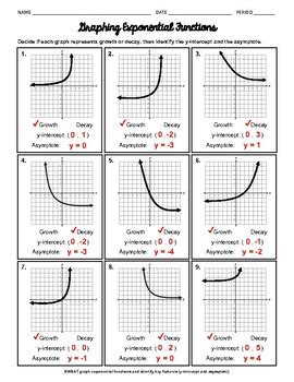 Step 4: Answer the Questions. After understanding the definition of an exponential function, examining the graph, and identifying the key characteristics, you should be ready to answer the questions on a graphing exponential functions worksheet. Questions may ask you to identify the y-intercept and x-intercept, calculate the rate of change, or graph a new exponential function.