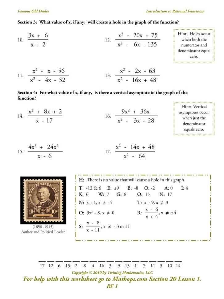 When teaching rational functions, a worksheet can be a great tool to help students understand the topic. A worksheet helps to break down the concept into smaller, more manageable pieces. This allows students to focus on each part of the concept and gain a better understanding of the overall topic.