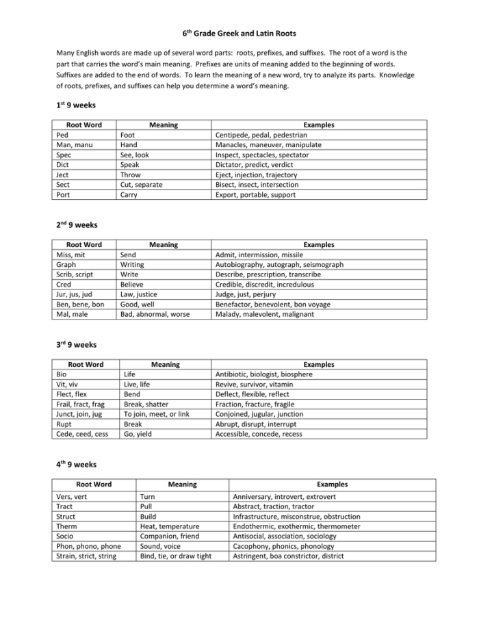 Incorporating Greek and Latin roots worksheets into the curriculum is a great way to enhance students’ understanding of the English language. By becoming familiar with the roots of words, students can recognize patterns and make educated guesses as to the meaning of unfamiliar words. This process of making educated guesses is an important skill for students to master, as it helps them become more proficient readers, writers, and spellers.