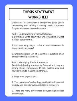 A thesis statement worksheet can be a valuable tool for students who are writing essays, reports, and other pieces of academic writing. This worksheet can help students to create a thesis statement that is both clear and concise. By providing a structured framework, a thesis statement worksheet can help students to focus their writing, avoid common mistakes, and create an essay that is well-structured and cohesive.