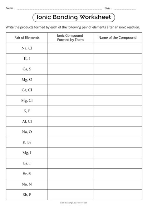 Ionic bonding is a type of chemical bond that involves the transfer of electrons from one atom to another. An ionic bonding worksheet key can be an invaluable tool for reinforcing your understanding of ionic bonding. Here are some tips for how to utilize an ionic bonding worksheet key to maximize your learning.