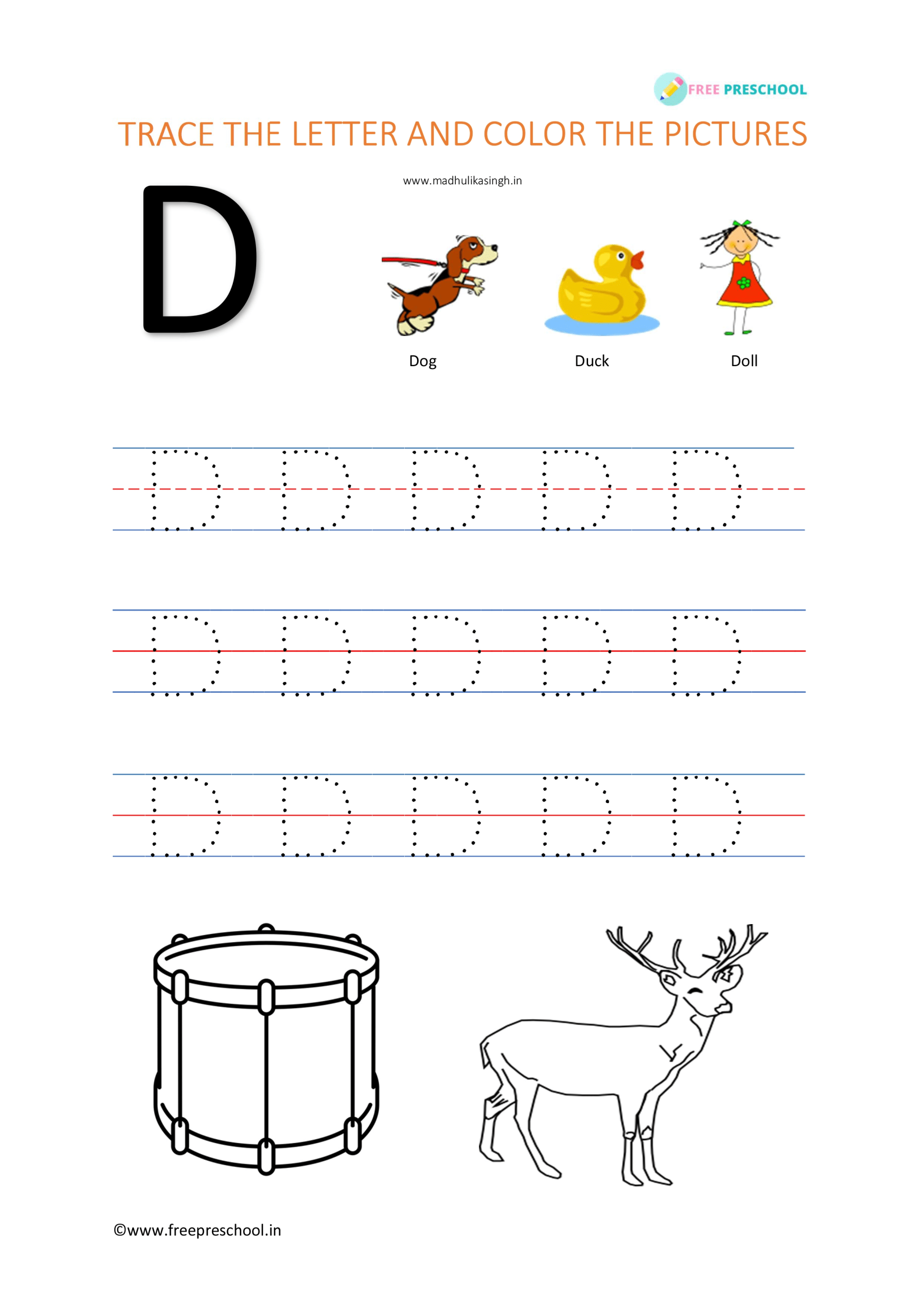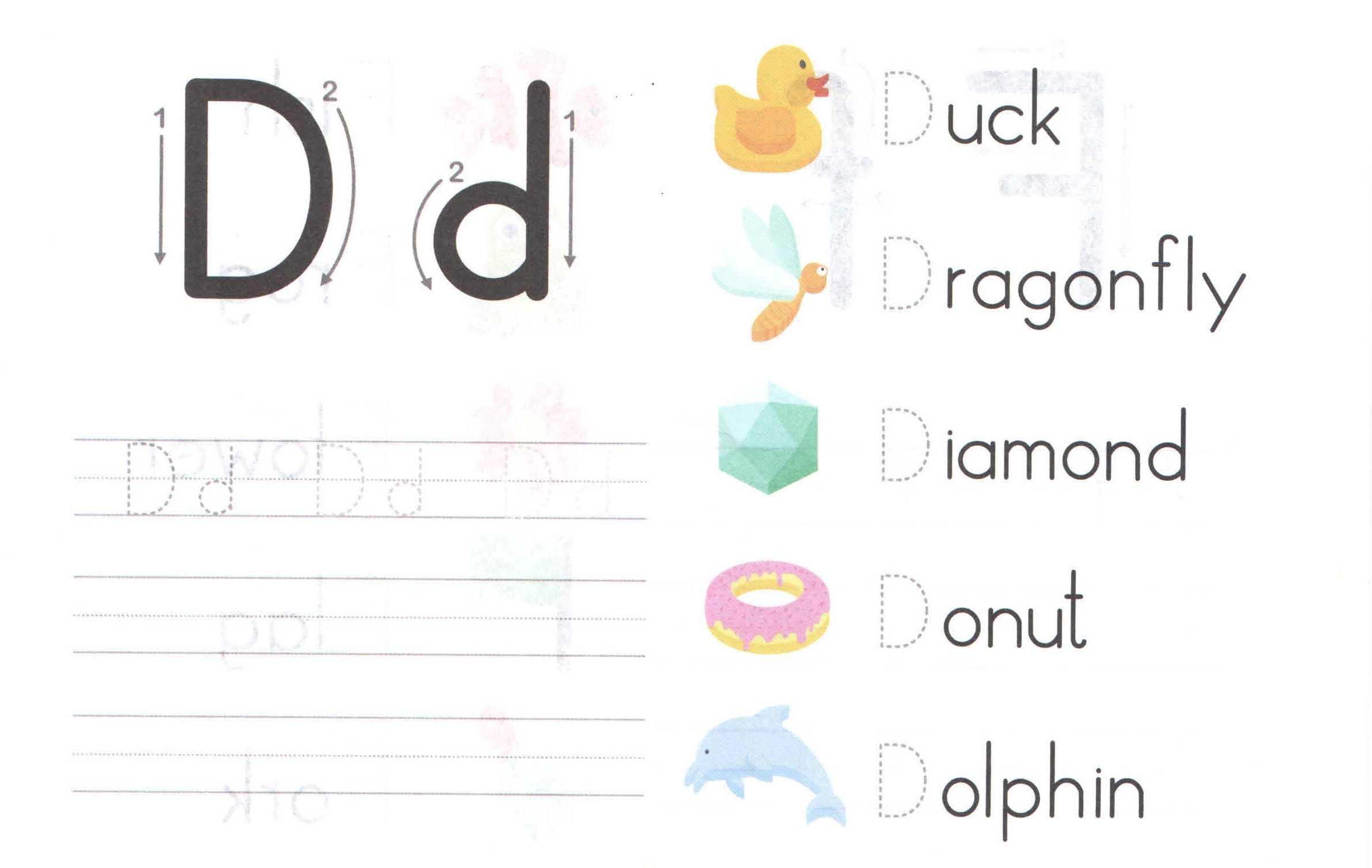 The worksheet begins with a tracing exercise. Students are asked to trace the letter D, paying attention to the curved lines and the shape of the letter. This activity helps to improve a child’s hand-eye coordination and grasp of the alphabet.